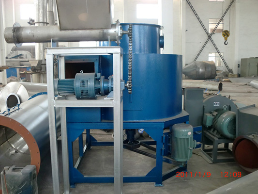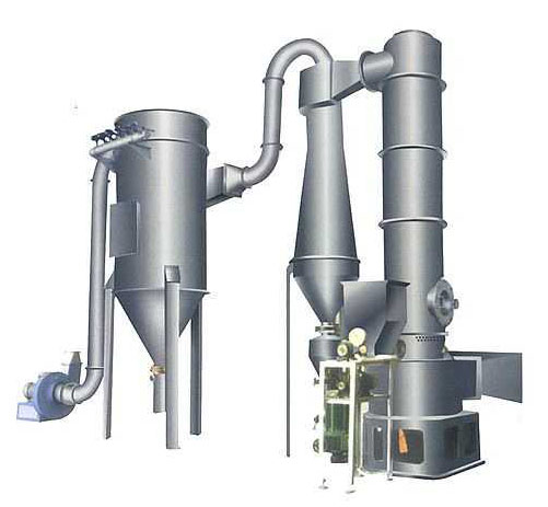Tangent into the bottom of the hot air dryer, a powerful rotating wind field is formed in the driving of the stirrer. Paste material from the screw feeder into the dryer at high speed stirring blade intense action, the material by the impact, the role of friction and shearing force is dispersed, the bulk materials will soon be smashed full contact with the hot air, heat ,dry. The dehydrated material dry with hot air rising, grade large ring particle retention, small particles from the dryer exhaust outside the center of the ring by the cyclone and dust recycling, not dry or bulk materials Shuaixiang wall by centrifugal force again fall to the bottom was crushed dried.