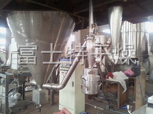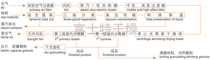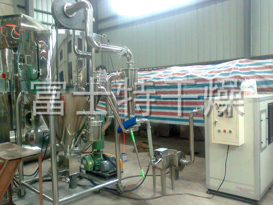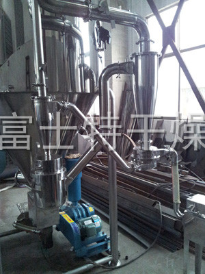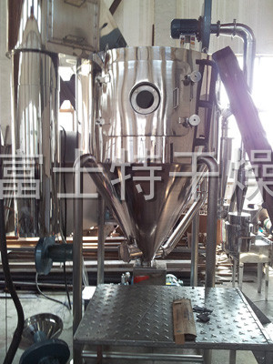 该机采用全封闭形式,所有部件均采用不锈钢制造,配有三级净化装置,过滤后的空气达十万级要求。筒体与顶部装有冷壁装置,使壁温<80℃,干燥塔内装有气刷扫塔装置。经该机干燥后的中药浸膏粉,不会出现焦化变质现象,大大增加了收粉率(95%以上),而且不会产生混药现象和粘壁现象。