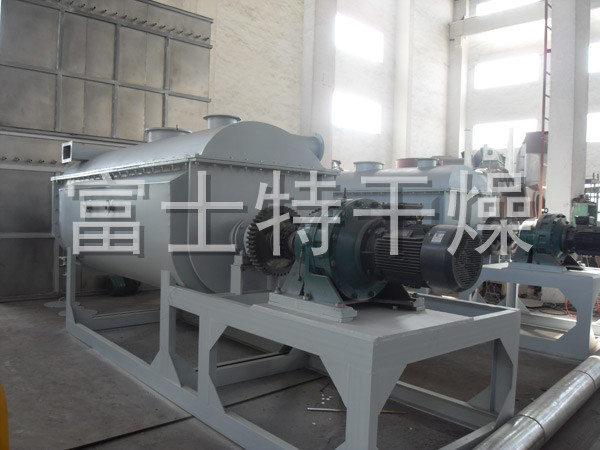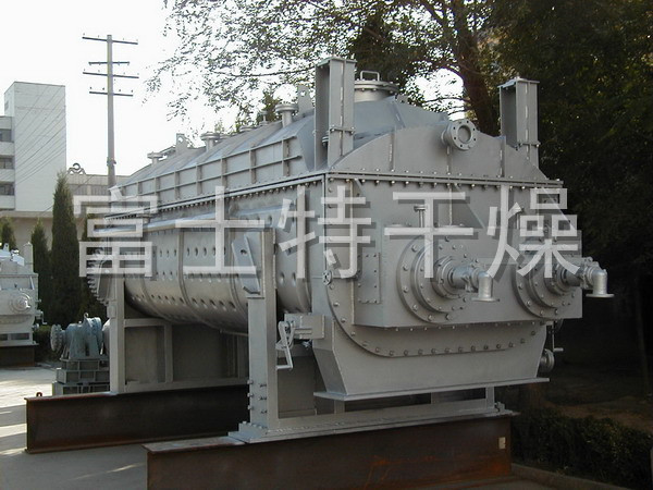 空心轴上密集排列着楔型中空浆叶,热介质经空心轴流经浆叶。单位有效容积内传热面积很大,热介质温度从-40℃到320℃,可以是水蒸汽,也可以是液体型:如热水、导热油等。间接传导加热,没有携带空气带走热量,热量均用来加热物料。热量损失仅为通过器体保温层向环境的散热。楔型浆叶传热面具有自清洁功能。物料颗粒与楔型面的相对运动产生洗刷作用,能够洗刷掉楔型面上附着物料,使运转中一直保持着清洁的传热面。浆叶干燥机的壳体为Ω型,壳体内一般安排二到四根空心搅拌轴。壳体有密封端盖与上盖,防止物料粉尘外泄而充分发挥作用。
