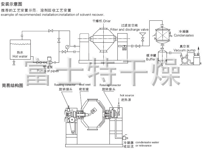 ◎物料处于真空状态,蒸汽压下降使物料表面的水份(溶剂)达到饱和状态而蒸发了,并由真空泵及时排出回收。物料内部的水份(溶剂)不断地向表面渗透、蒸发、排出三个过程不断进行,物料在很短时间内达到干燥目的。