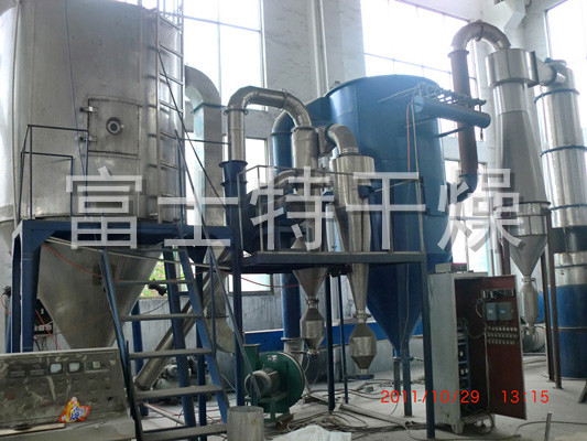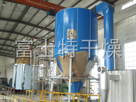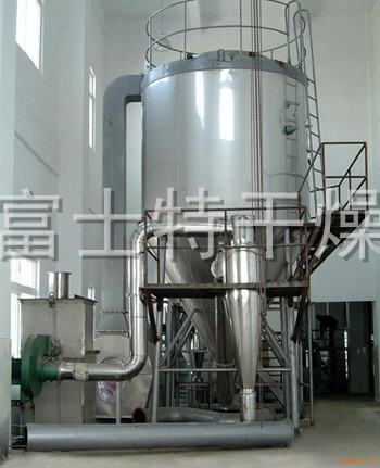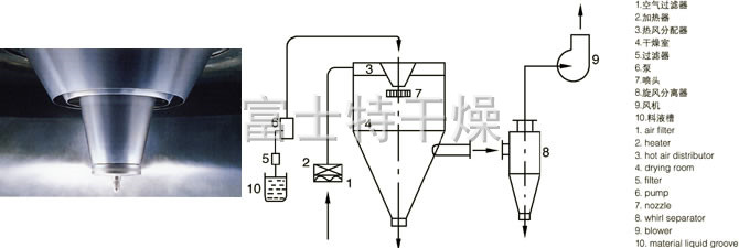 空气经过滤和加热,进入干燥器顶部空气分配器,热空气呈螺旋状均匀地进入干燥室。料液经塔体顶部的高速离心雾化器,(旋转)喷雾成极细微的雾状液珠,与热空气并流接触在极短的时间内可干燥为成品。成品连续地由干燥塔底部和旋风分离器中输出,废气由风机排空。
