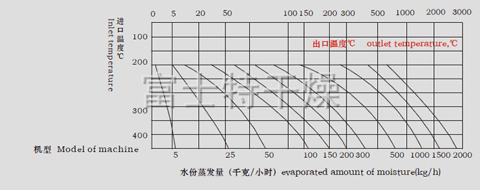 注:水份蒸发量与物料的特性及热进风、出口温度相关。当出口温度为90oC,其水份蒸发曲线见上图(供选型参考),随着产品不断更新,有关参数变更,恕不预先通知。