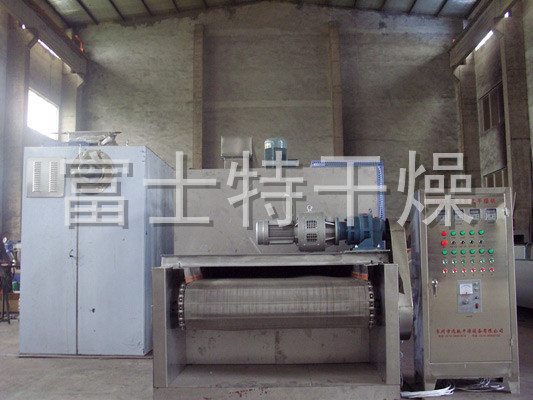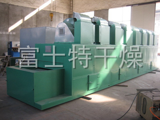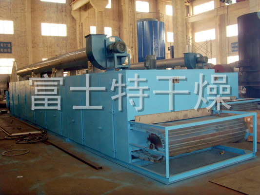 物料由加料器均匀地铺在网带上,网带一般采用12-60目不锈钢丝网,由传动装置拖动在干燥机内移动。干燥机由若干单元组成,每一单元热风独立循环,部分尾气由专门排湿风机排出,废气由调节阀控制,热气由下往上或由上往下穿过铺满物料的网带完成热量与质量传递的进程,带走物料水份。网带缓慢移动,运行速度可根据物料温度自由调节,干燥后的成品连续落入收料器中。上下循环单元根据用户需要可灵活配备,单元数量亦可根据需要选取。