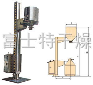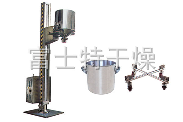TJG 系列固定提升加料机由两部分组成,即提升机及底座。提升机由机架、液压提升系统及料门翻转机构组成。工作时,先将提升机的料门与料桶扣合,启动提升操作杆,料门与料桶一起上升,启动翻转操作杆,料桶即可番转180度,呈底桶向上姿态并移动到所需位置,利用料门上出料蝶阀,可很容易将物料加入所需的工艺设备中。